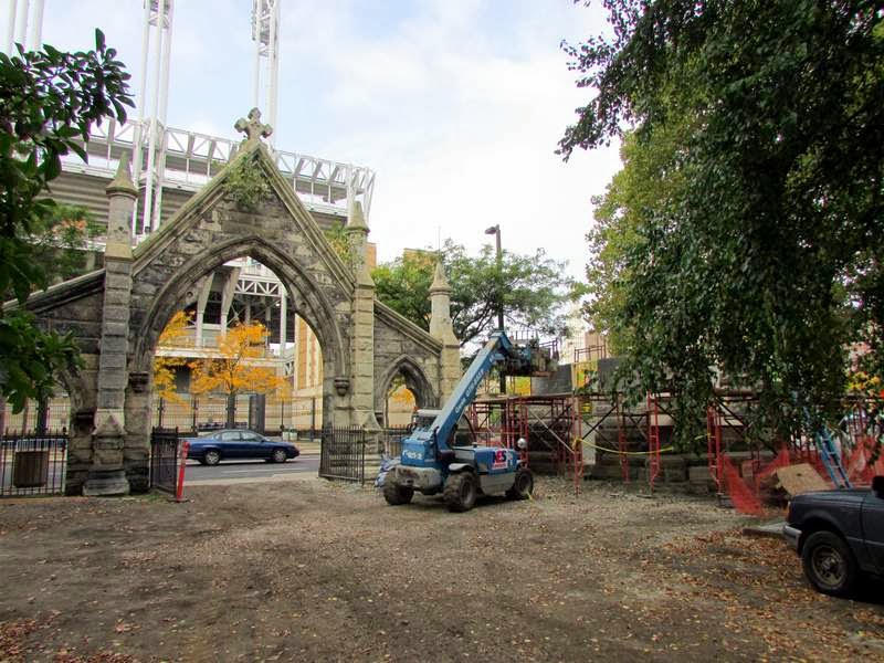 Wednesday, i got around to visit again. That night Cleveland was to host a playoff game with Tampa Bay. Also, the gate house to the cemetery was being put up again, after disassembly.